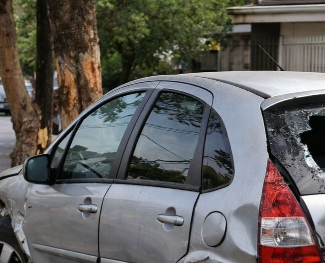 Um automóvel Citroën C3 foi abandonado pelo condutor após perder o controle e bater contra duas árvores e um canteiro de flores na Rua Carlos Gomes, em São Borj...