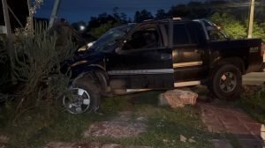 Com a colisão, o motorista perdeu o controle do veículo, derrubou o muro de uma casa e arrancou parte da parede de outra residência. O condutor teve um corte na cabeça, sem gravidade, e a jovem não se feriu.