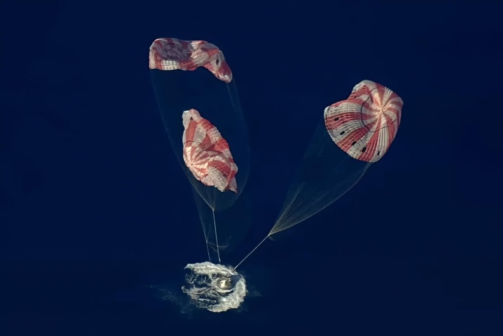 Após essa fase mais intensa, a cápsula iniciou a abertura dos paraquedas em etapas. Primeiro, os de estabilização ajudaram a controlar a trajetória. Em seguida, os três paraquedas principais entraram em ação, permitindo uma descida segura até o splashdown.