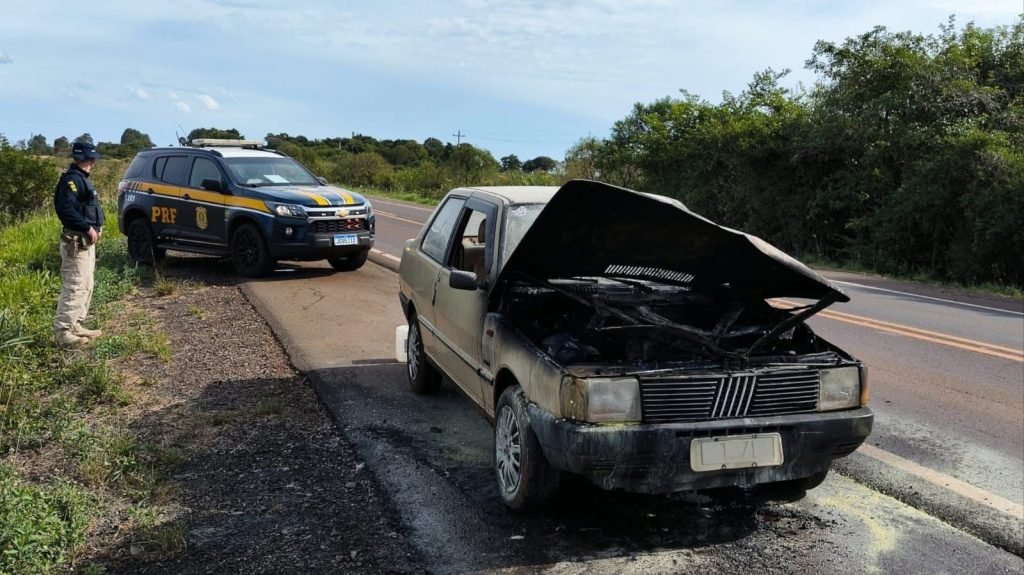 Um automóvel Fiat Prêmio ficou parcialmente destruído após sofrer um incêndio na tarde desta terça-feira (14), no km 412 da BR-472, em São Borja. O incidente ocorreu após o motor do veículo apagar enquanto a condutora, uma mulher de 69 anos, trafegava pela rodovia. De acordo com a Polícia Rodoviária Federal (PRF), as chamas iniciaram logo após a motorista estacionar o carro no acostamento.