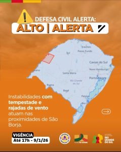 A Defesa Civil do Rio Grande do Sul emitiu um alerta para instabilidades climáticas com possibilidade de tempestade e rajadas de vento nas proximidades de São Borja. O aviso classifica a situação como condição de alerta e é válido até as 17h desta sexta-feira, 9 de janeiro.