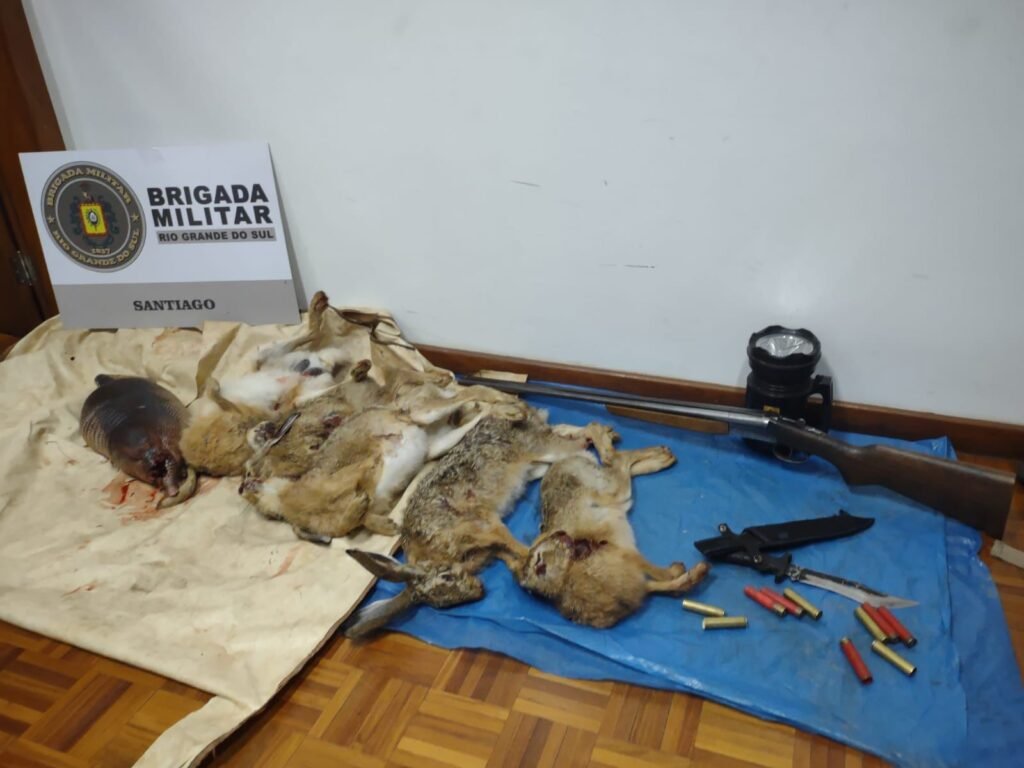 A equipe iniciou diligências logrando êxito em localizar o suspeito conduzindo um veículo. Foi realizada a abordagem sendo localizado no interior do carro CINCO lebres e UM tatu (ambos abatidos), uma espingarda calibre 28 com quatro munições carregadas e seis cartuchos deflagrados de calibre 28.