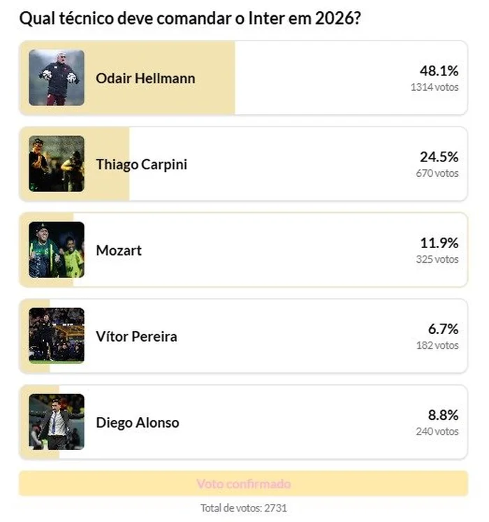 Mas quem deve assumir o Inter? Zero Hora questionou os leitores, nesta segunda-feira (8), e um nome saiu na frente na votação: Odair Hellmann, que conquistou 48% dos votos.