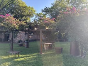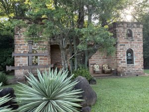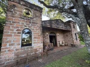 A arquitetura da vinícola chama a atenção logo na chegada: um projeto que remete às catedrais missioneiras, com tijolos à vista, formas rústicas e uma atmosfera de paz que combina com o cenário natural ao redor. O grande gramado, os vinhedos que se estendem pelo horizonte e o tradicional sino que dá nome à propriedade criam uma ambientação única, marcada por misticismo, história e acolhimento.