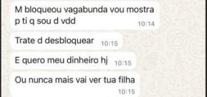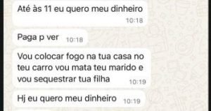 Nos prints tornados públicos, aparecem frases como “quero meu dinheiro hj”, “até às 11 eu quero meu dinheiro” e “paga pra ver”. Em outro trecho, a suspeita escreve: “vou colocar fogo na tua casa”, “vou matar teu marido” e “vou sequestrar tua filha”. As mensagens também indicam monitoramento da rotina da família e tentativas claras de intimidar as vítimas para forçar o pagamento.